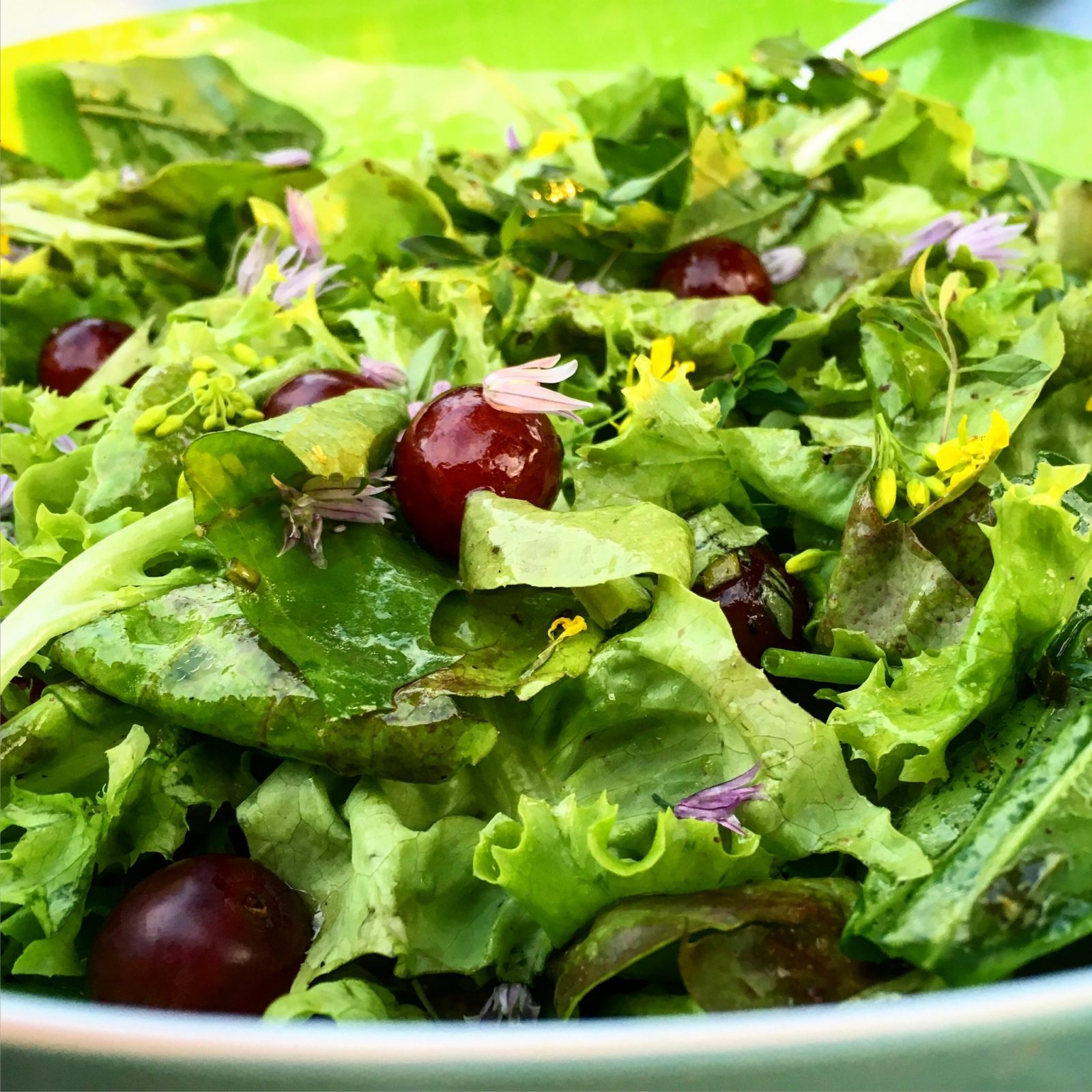 The thyme in our garden almost always survives winter and come spring, it is so fresh and delicious that I love using it in dressings and marinades, but feel free to substitute any herbs you have on hand. The dandelion leaves are a bitter and the mustard greens a bit spicy, so the honey and grapes add a nice sweet note.